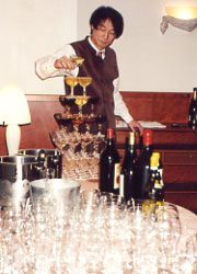 シャンパンピラミッドのグラスの組み方のコーチングの様子